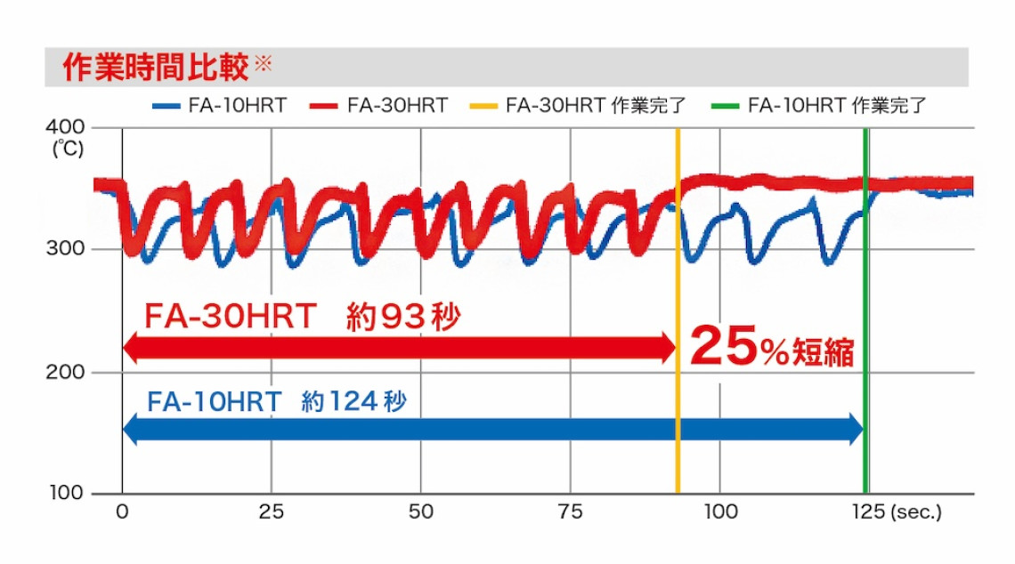 センサーを小型にすることで、ヒーターからの直接の熱による影響を排除。 - ヒーターをコイル状に隙間なく巻き、小型センサーもこて先先端近くに配置することで、立ち上がり時間とこて先の熱回復時間を大幅に短縮。