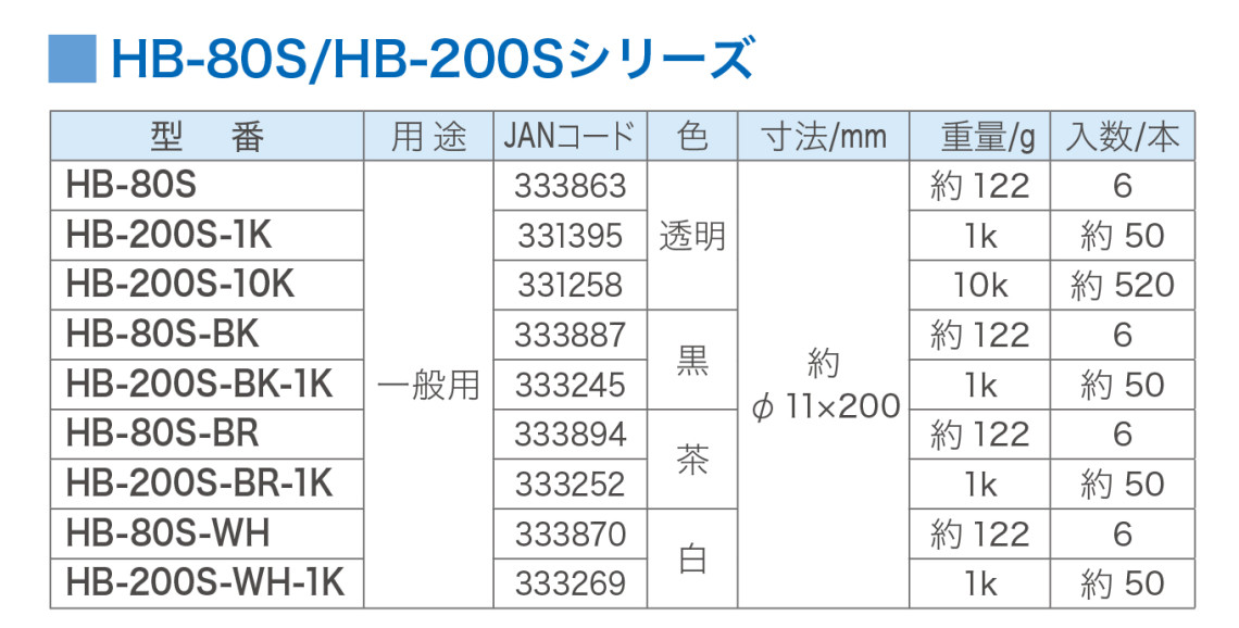 | HB-80S-WH | 一般用 | 333870 | 白 | 約Φ11×200 | 約122g | 6 |