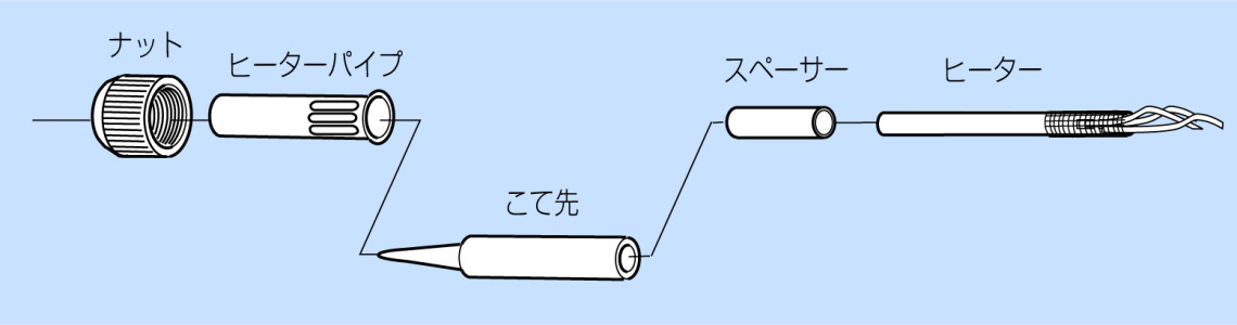 ナットを緩め、ヒーターパイプ、こて先、スペーサーの順で取り外します。組み立ては逆の手順で行ってください。
