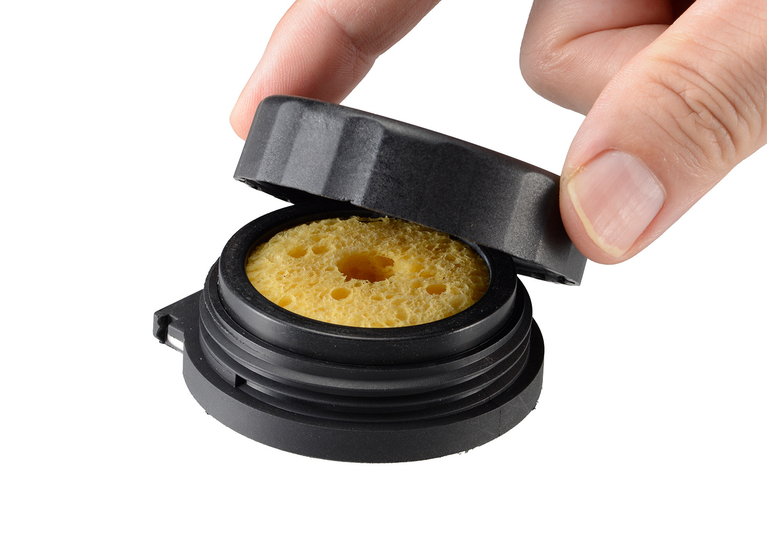 フタ付きこて先クリーナーで、作業時の濡れたスポンジでも工具箱に入れて簡単に持ち運びできます。