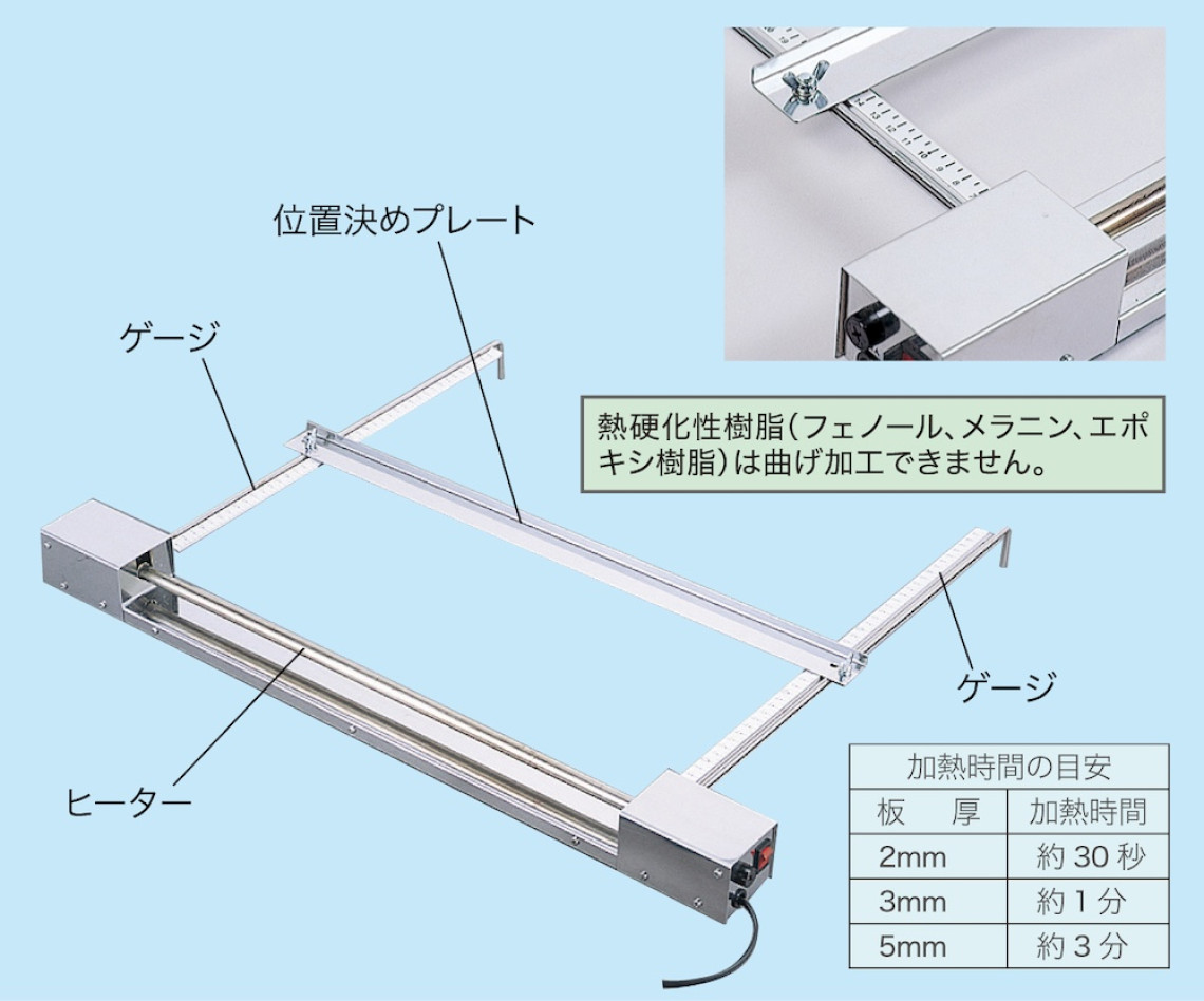位置決めプレートとゲージ付でアクリル板の保持、折り曲げ位置決めが容易にできます。