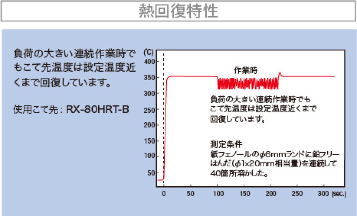 優れた熱回復力により負荷の大きい連続作業時でもこて先温度低下がほとんど気になりません(PAT.)。鉛フリーはんだ付け作業に最適です。